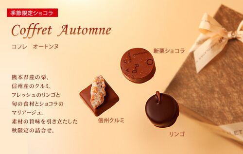 Coffret Automne コフレ オートンヌ熊本県産の栗、信州産のクルミ、フレッシュのリンゴと旬の食材とショコラのマリアージュ。 素材の旨味を引き立たした秋限定の詰合せ。 信州クルミ 年々貴重になる信州産のくるみを100%使用。 食感をいかしたプラリネのシ…
