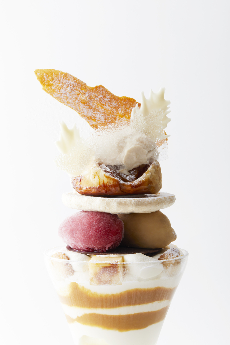 トッピングのゴーフルに、カルヴァドスのソルベやアップルパイ。ファーブルトンや、ガレットブルトンヌなど、フランス北西部の様々な地方菓子を詰め込み、次々と味わいや食感が変化していく、甘いもの好きにはたまらない贅沢パフェ。塩キャラメルのソースと、中央に忍ばせたやや酸味を感じる濃厚カカオのシャーベットは、チーズ入りのホワイトチョコレートクリームと絶妙なバランスで調和しています。さらに洋梨を加えたアップルシードルのジュレや、赤ワインのソルベを組み合わせ、大人向けのパフェに仕上げました。