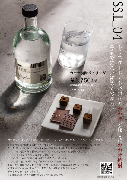 2022-07-23 カカオ焼酎ペアリング ショコラティエ パレドオール 東京店・大阪店にて 『カカオ焼酎ペアリング』の限定メニューが登場。 無くなり次第、販売終了となります。 お早目にご来店くださいませ。
